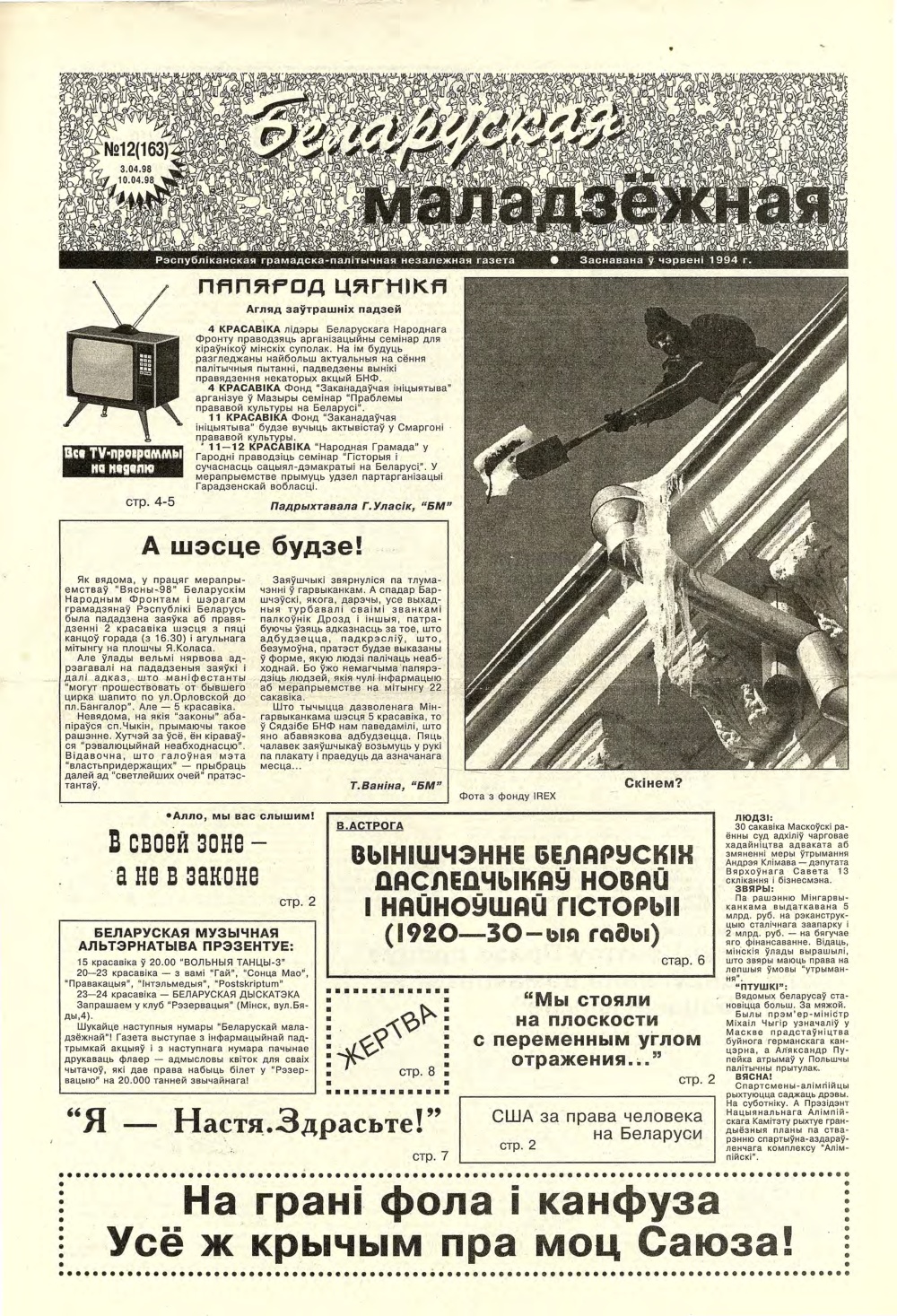 «Беларуская маладзёжная» (1994 - 2002) — беларуская газэта, дадатак да аднайменнай радыёстанцыі. Зарэгістраваная ў сакавіку 1994 году. У ёй друкаваліся расшыфроўкі радыйных гутарак, анонсы этэраў і ўсё, што не зьмяшчалася ў радыёфармат. Калі радыёстанцыю зачынілі, газэта засталася. Галоўны рэдактар — Тацьцяна Мельнічук. Традыцыйны фармат — 8 старонак А3. Газэта асьвятляла нараджэньне й разьвіцьцё палітычнай апазыцыі сярэдзіны-канца 1990-х, дзейнасьць незарэгістраваных моладзевых аб'яднаньняў з усіх бакоў палітычнага сьпектру, сачыла за разьвіцьцём й актуальным станам альтэрнатыўнай моладзевай культуры Беларусі. З 1995 па 1998 рэдакцыя газэты праводзіла у Менску вулічны рок-фэст «Купальле з Беларускай маладзёжнай». Апошні нумар выйшаў у чэрвені 2002 году. У кастрычніку 2003 году пасьведчаньне аб рэгістрацыі было скасаванае міністэрствам інфармацыі РБ. Крыница: be-tarask.wikipedia.org