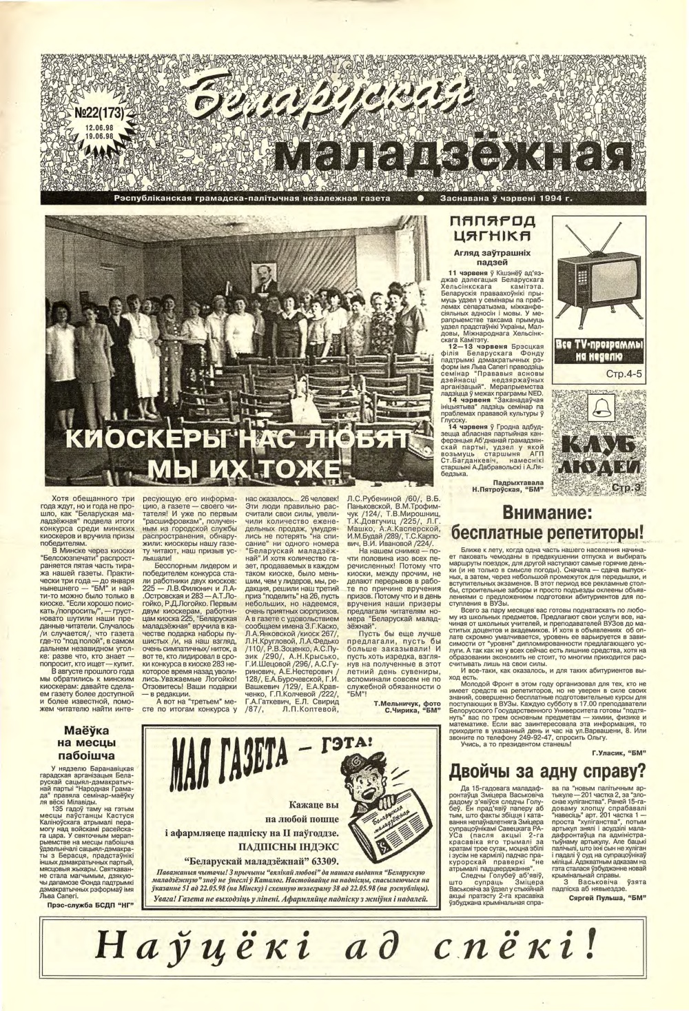 «Беларуская маладзёжная» (1994 - 2002) — беларуская газэта, дадатак да аднайменнай радыёстанцыі. Зарэгістраваная ў сакавіку 1994 году. У ёй друкаваліся расшыфроўкі радыйных гутарак, анонсы этэраў і ўсё, што не зьмяшчалася ў радыёфармат. Калі радыёстанцыю зачынілі, газэта засталася. Галоўны рэдактар — Тацьцяна Мельнічук. Традыцыйны фармат — 8 старонак А3. Газэта асьвятляла нараджэньне й разьвіцьцё палітычнай апазыцыі сярэдзіны-канца 1990-х, дзейнасьць незарэгістраваных моладзевых аб'яднаньняў з усіх бакоў палітычнага сьпектру, сачыла за разьвіцьцём й актуальным станам альтэрнатыўнай моладзевай культуры Беларусі. З 1995 па 1998 рэдакцыя газэты праводзіла у Менску вулічны рок-фэст «Купальле з Беларускай маладзёжнай». Апошні нумар выйшаў у чэрвені 2002 году. У кастрычніку 2003 году пасьведчаньне аб рэгістрацыі было скасаванае міністэрствам інфармацыі РБ. Крыница: be-tarask.wikipedia.org
