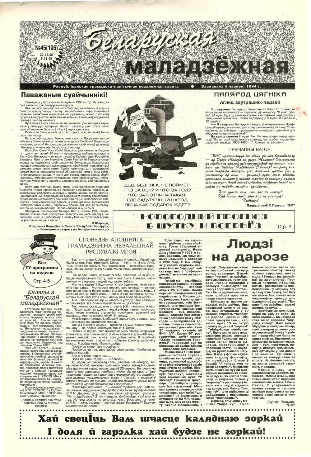 «Беларуская маладзёжная» (1994 - 2002) — беларуская газэта, дадатак да аднайменнай радыёстанцыі. Зарэгістраваная ў сакавіку 1994 году. У ёй друкаваліся расшыфроўкі радыйных гутарак, анонсы этэраў і ўсё, што не зьмяшчалася ў радыёфармат. Калі радыёстанцыю зачынілі, газэта засталася. Галоўны рэдактар — Тацьцяна Мельнічук. Традыцыйны фармат — 8 старонак А3. Газэта асьвятляла нараджэньне й разьвіцьцё палітычнай апазыцыі сярэдзіны-канца 1990-х, дзейнасьць незарэгістраваных моладзевых аб'яднаньняў з усіх бакоў палітычнага сьпектру, сачыла за разьвіцьцём й актуальным станам альтэрнатыўнай моладзевай культуры Беларусі. З 1995 па 1998 рэдакцыя газэты праводзіла у Менску вулічны рок-фэст «Купальле з Беларускай маладзёжнай». Апошні нумар выйшаў у чэрвені 2002 году. У кастрычніку 2003 году пасьведчаньне аб рэгістрацыі было скасаванае міністэрствам інфармацыі РБ. Крыница: be-tarask.wikipedia.org