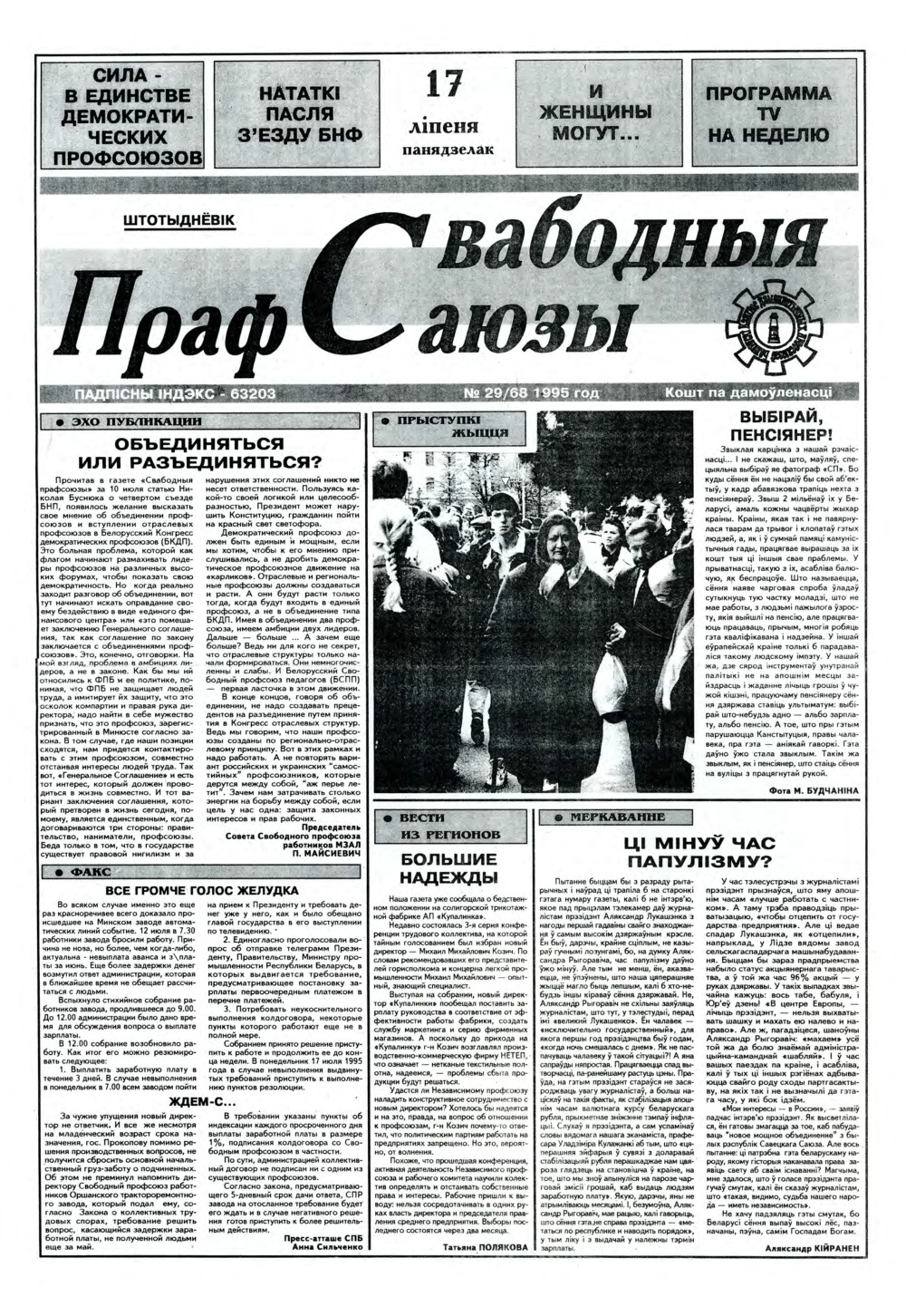 Свабодныя прафсаюзы 29 (68) 1995